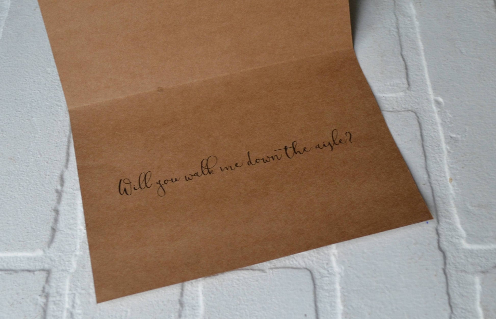 On your wedding day you will be giving someone the honor of walking you down the aisle. Ask this special person in a very special way. Let your step father who was there for you know how much you care. Ask them with this sweet bridal card. Show the person giving you away how much you care with this kraft proposal card.
