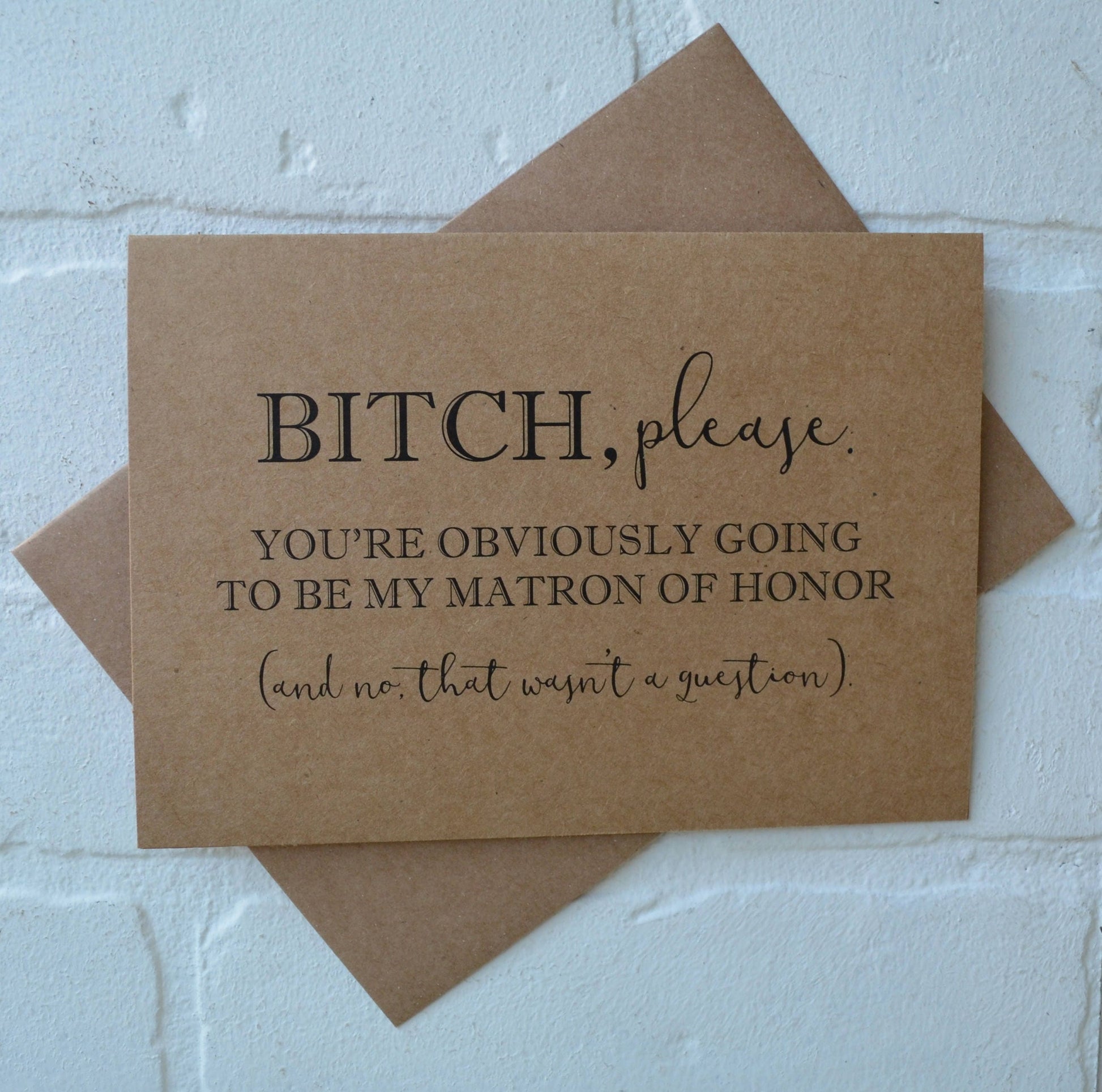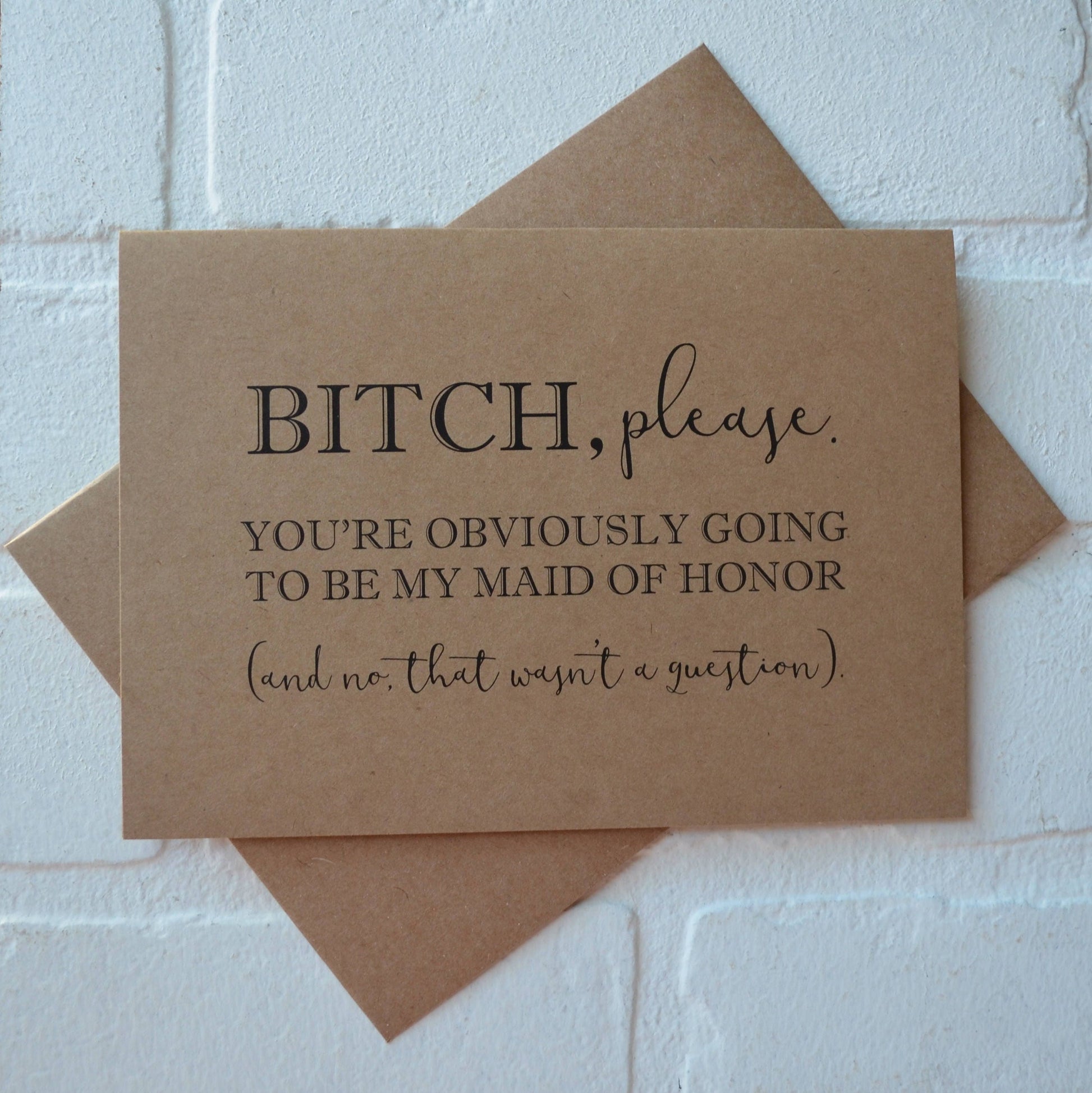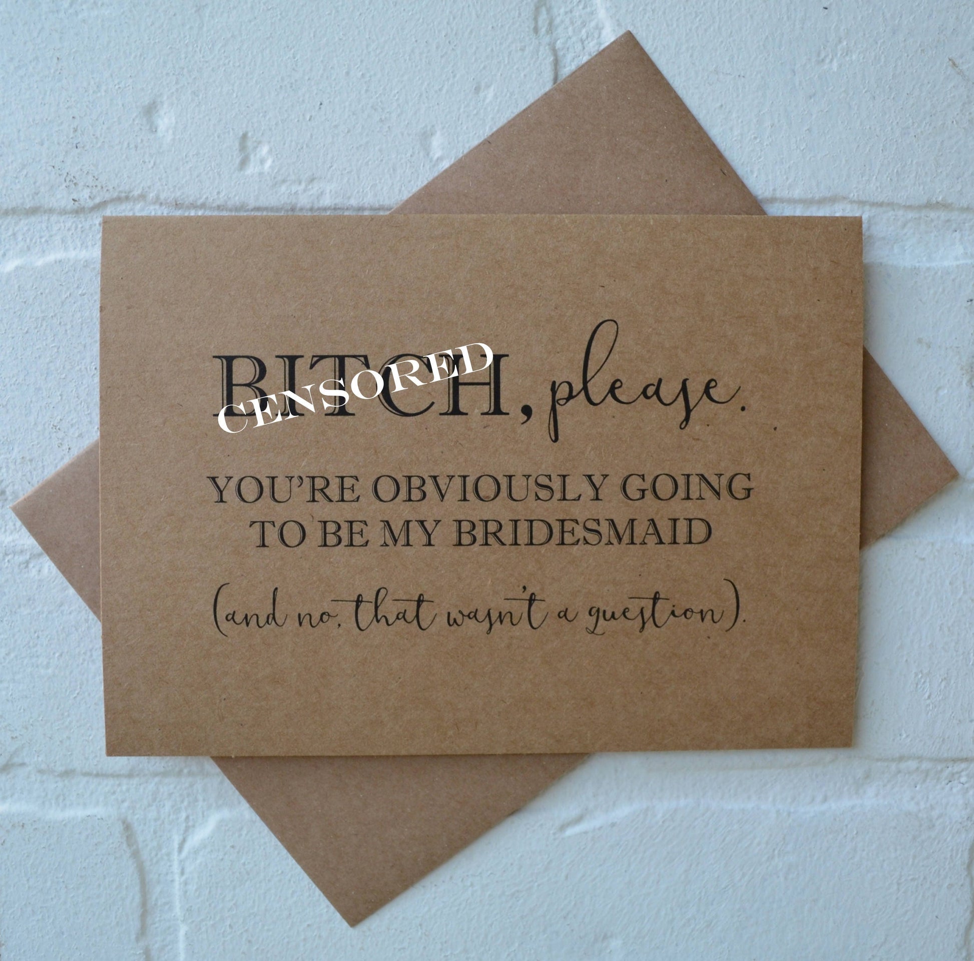 Invite your closet friends to be your bridesmaid with this funny folded card. Printed on *kraft cardstock including envelope.