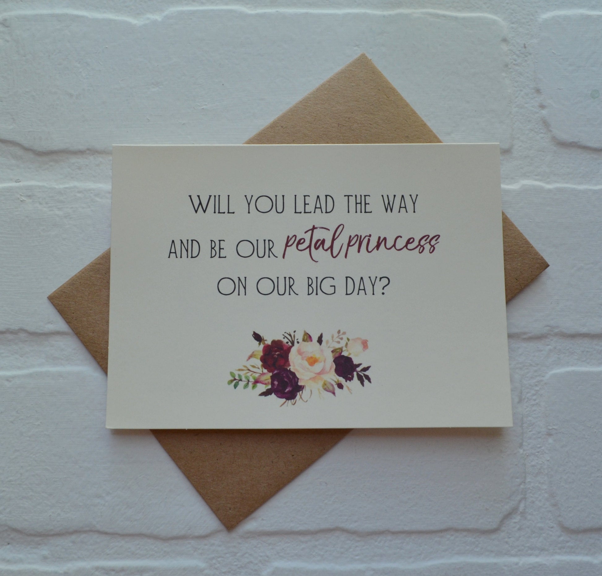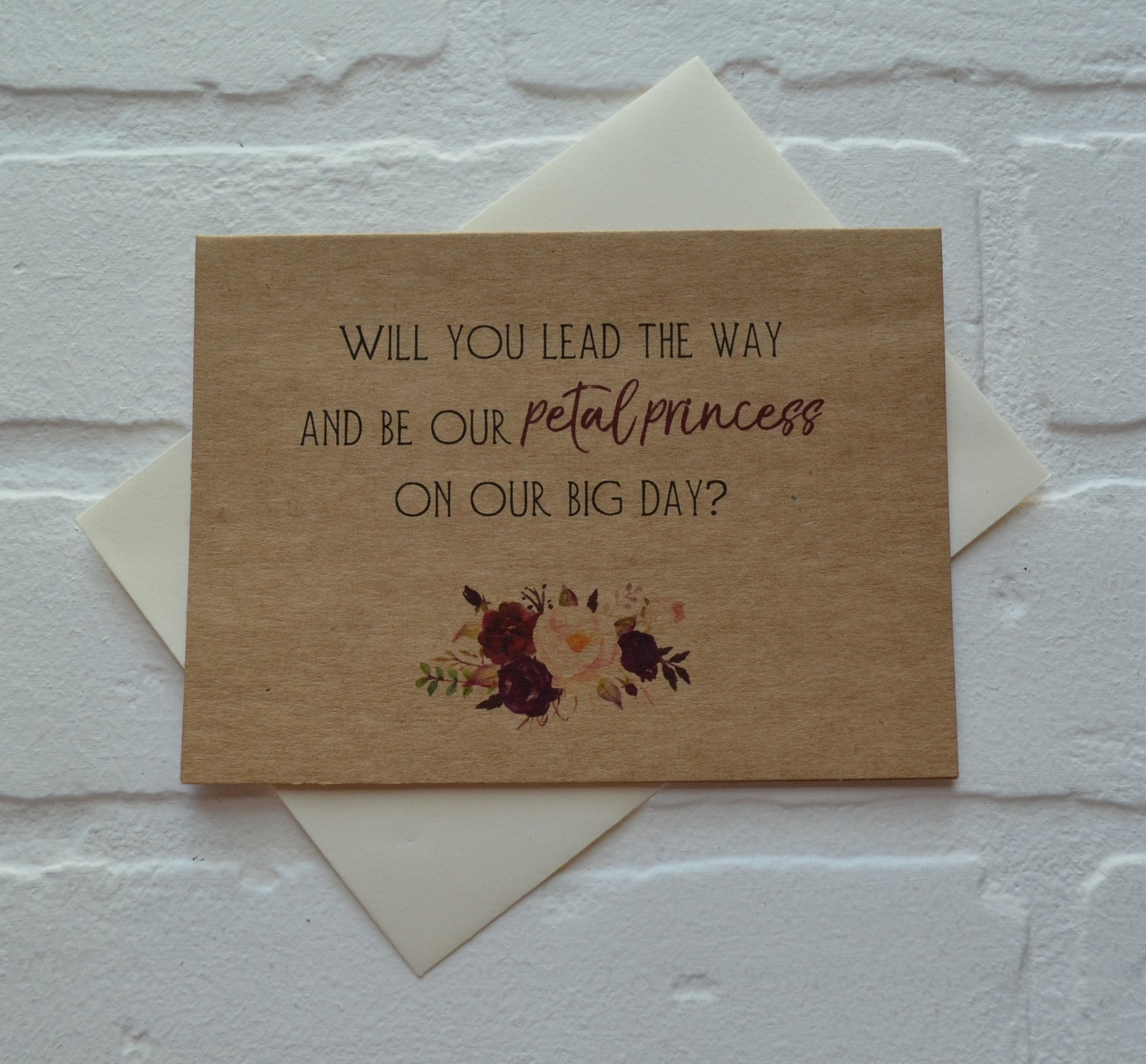 Invite your little friends to be your flower girl with this bridal card. Sweet spin on a flower girl...a PETAL PRINCESS! This flower girl card is blank inside leaving you plenty of space to write a meaningful note to your future flower girl. Card comes with a matching envelope PRINTING ===========