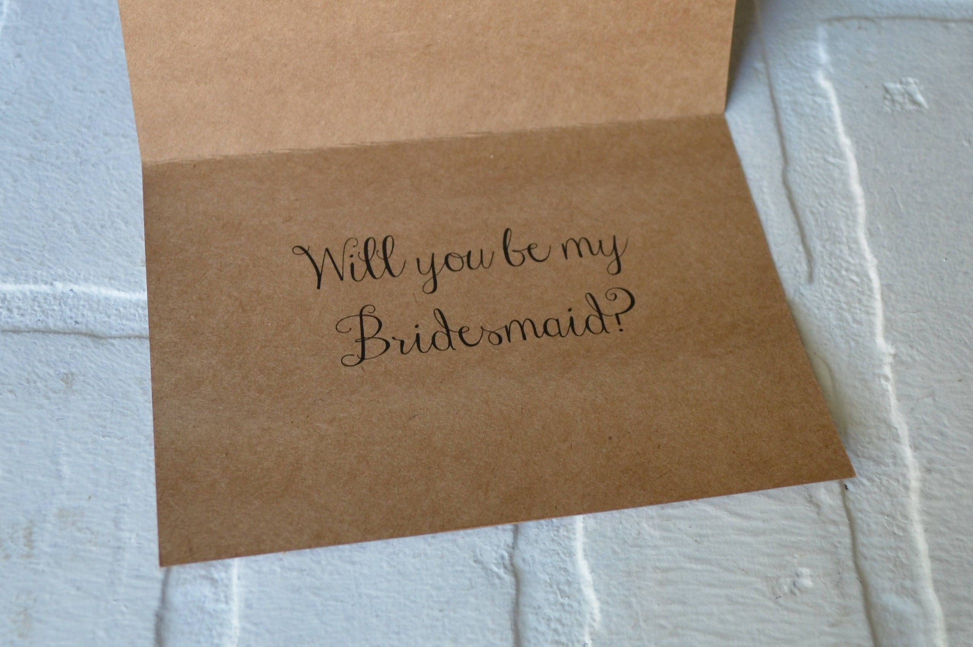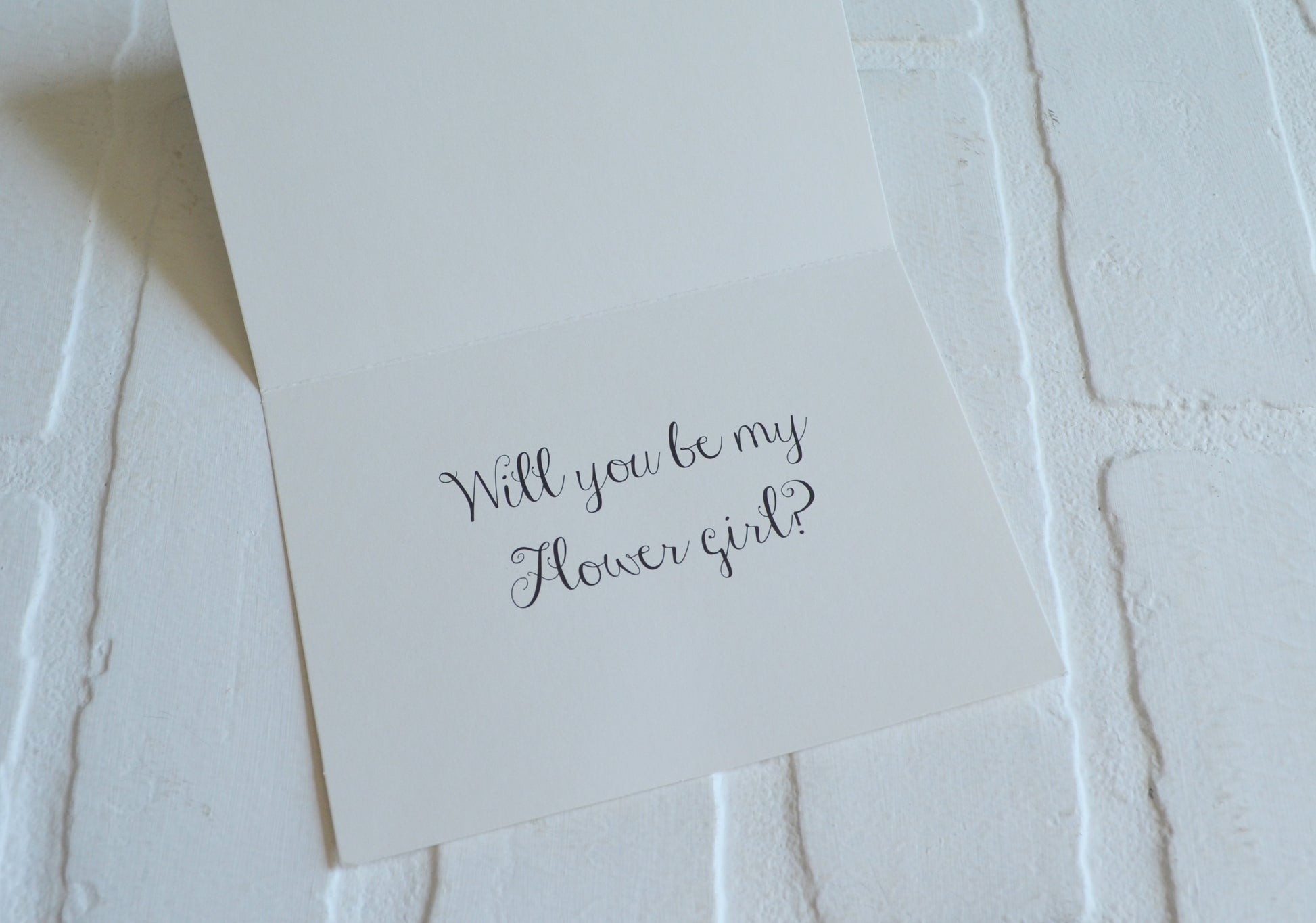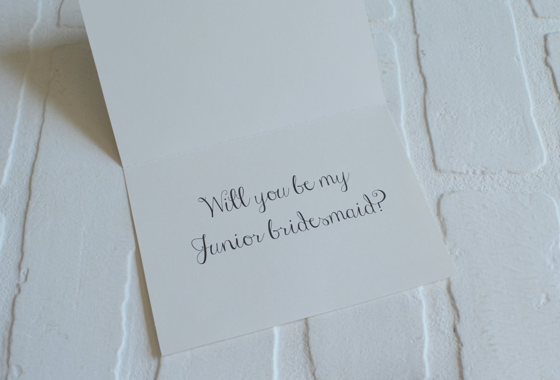 (Inside): "Will you be my (maid of honor, matron of honor, bridesmaid, junior bridesmaid, flower girl or personal attendant)?"