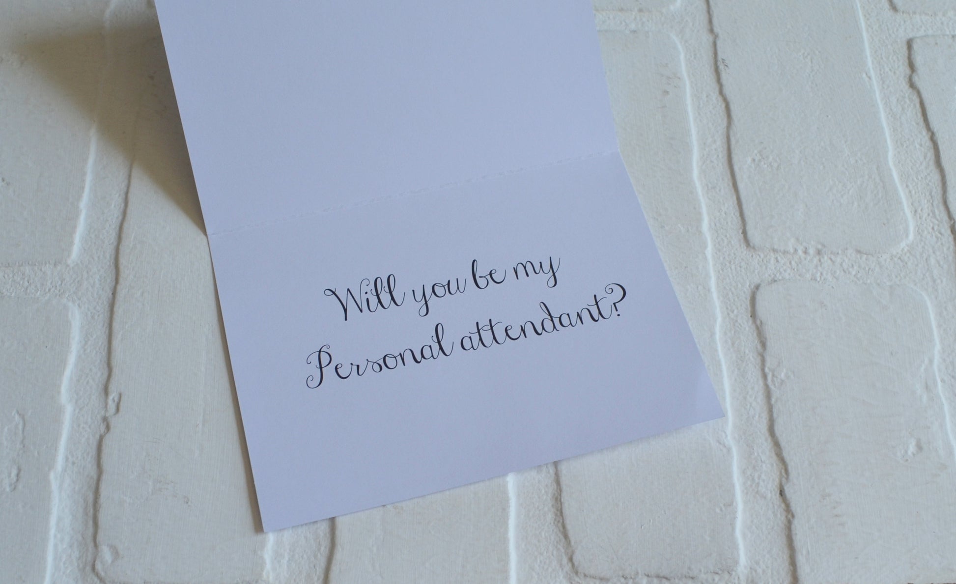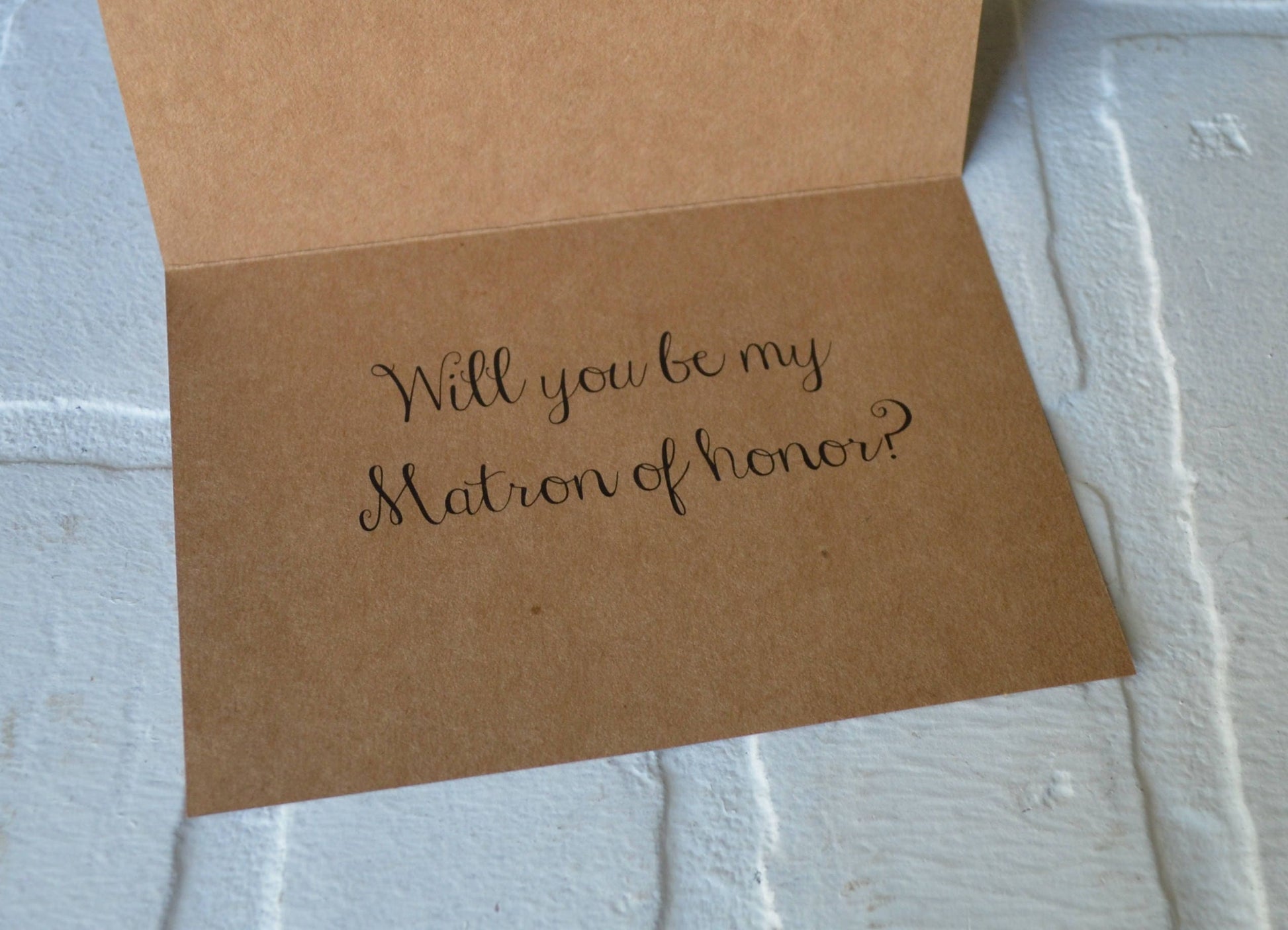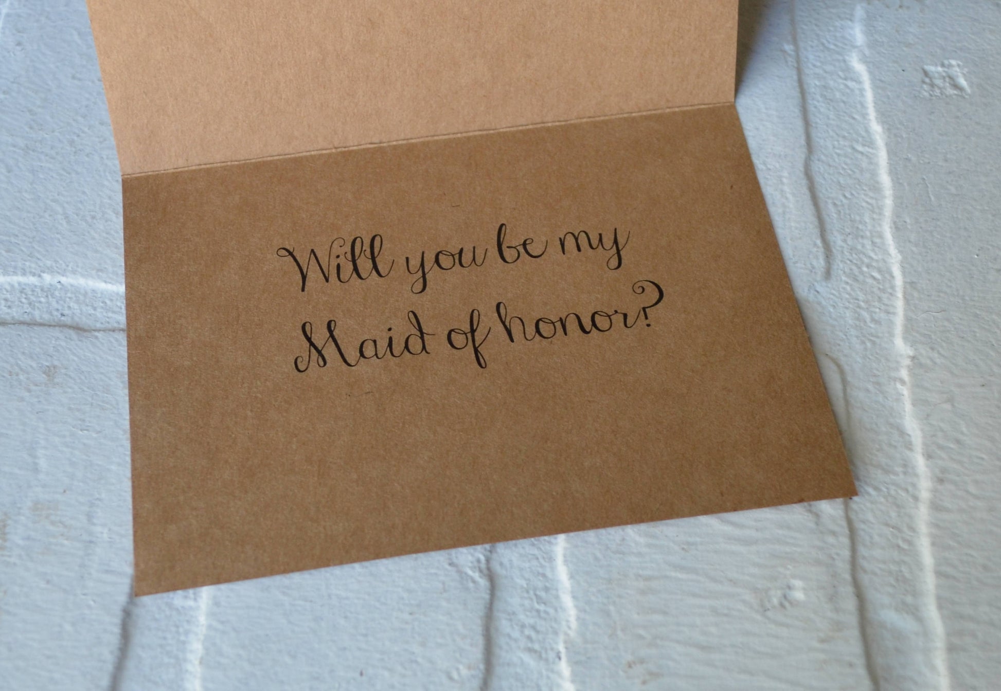 (Inside): "Will you be my (maid of honor, matron of honor, bridesmaid, junior bridesmaid, flower girl or personal attendant)?"