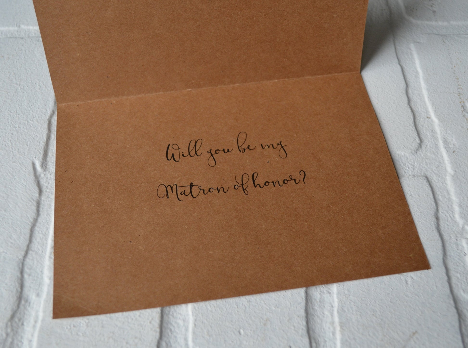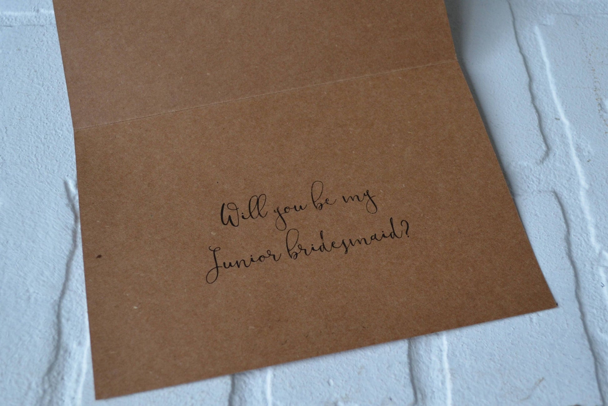 Inside: "Will you be my (bridesmaid, maid of honor, matron of honor, personal attendant, junior bridesmaid or flower girl?"