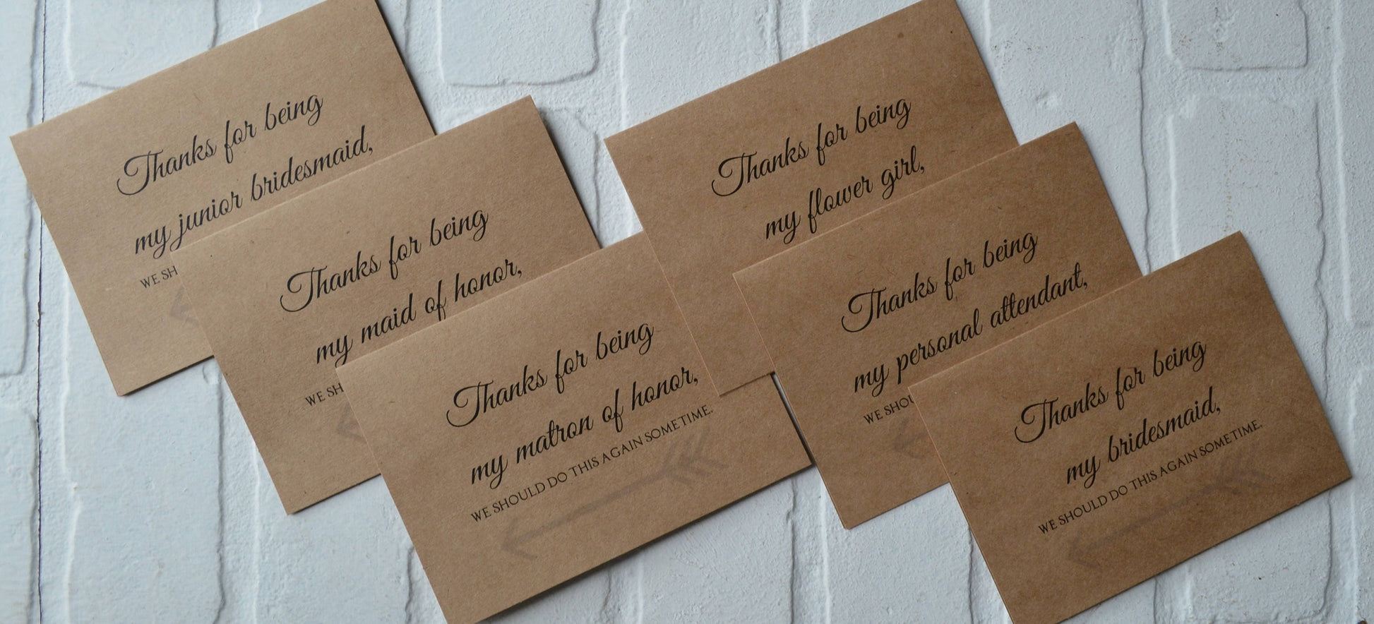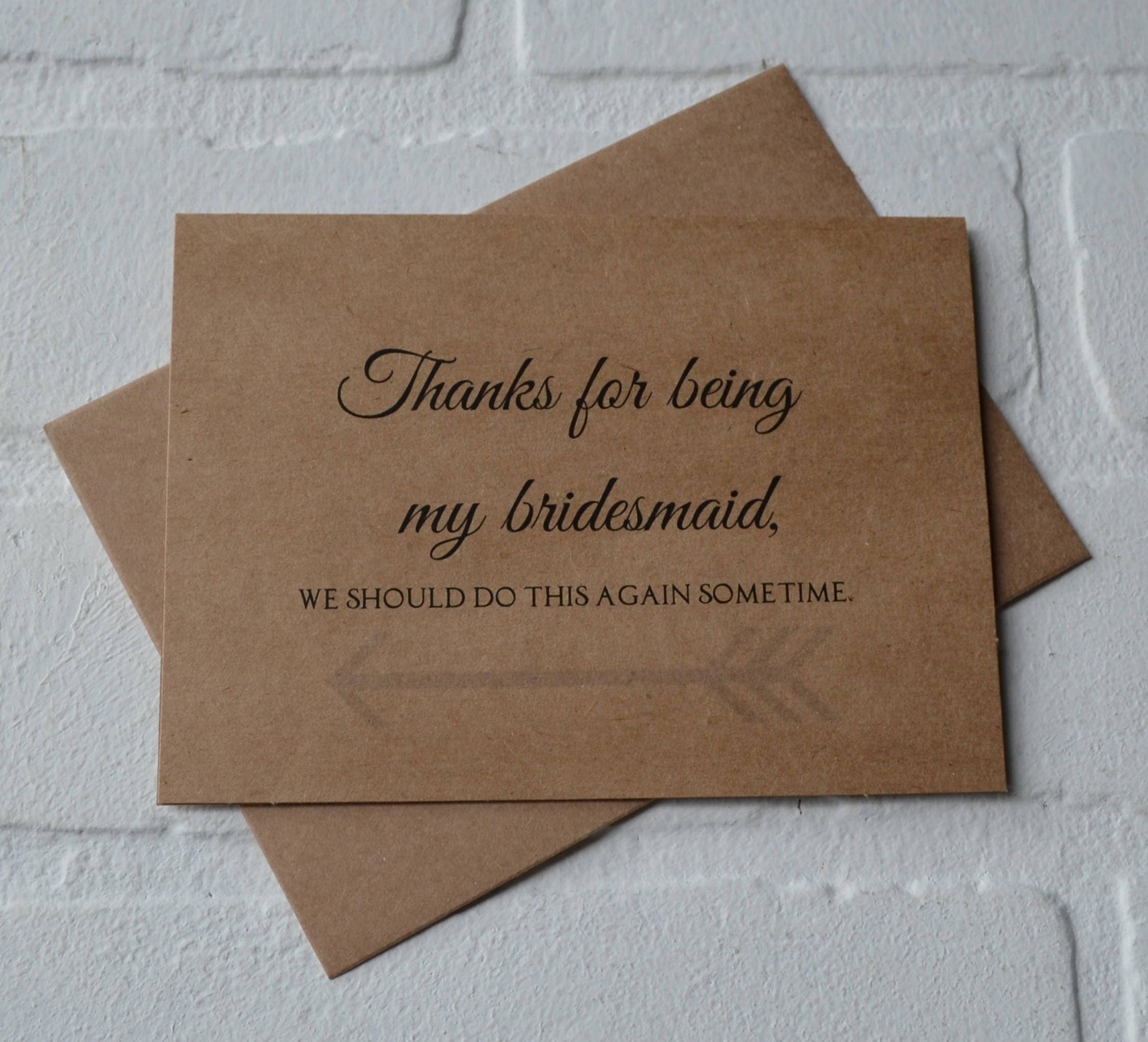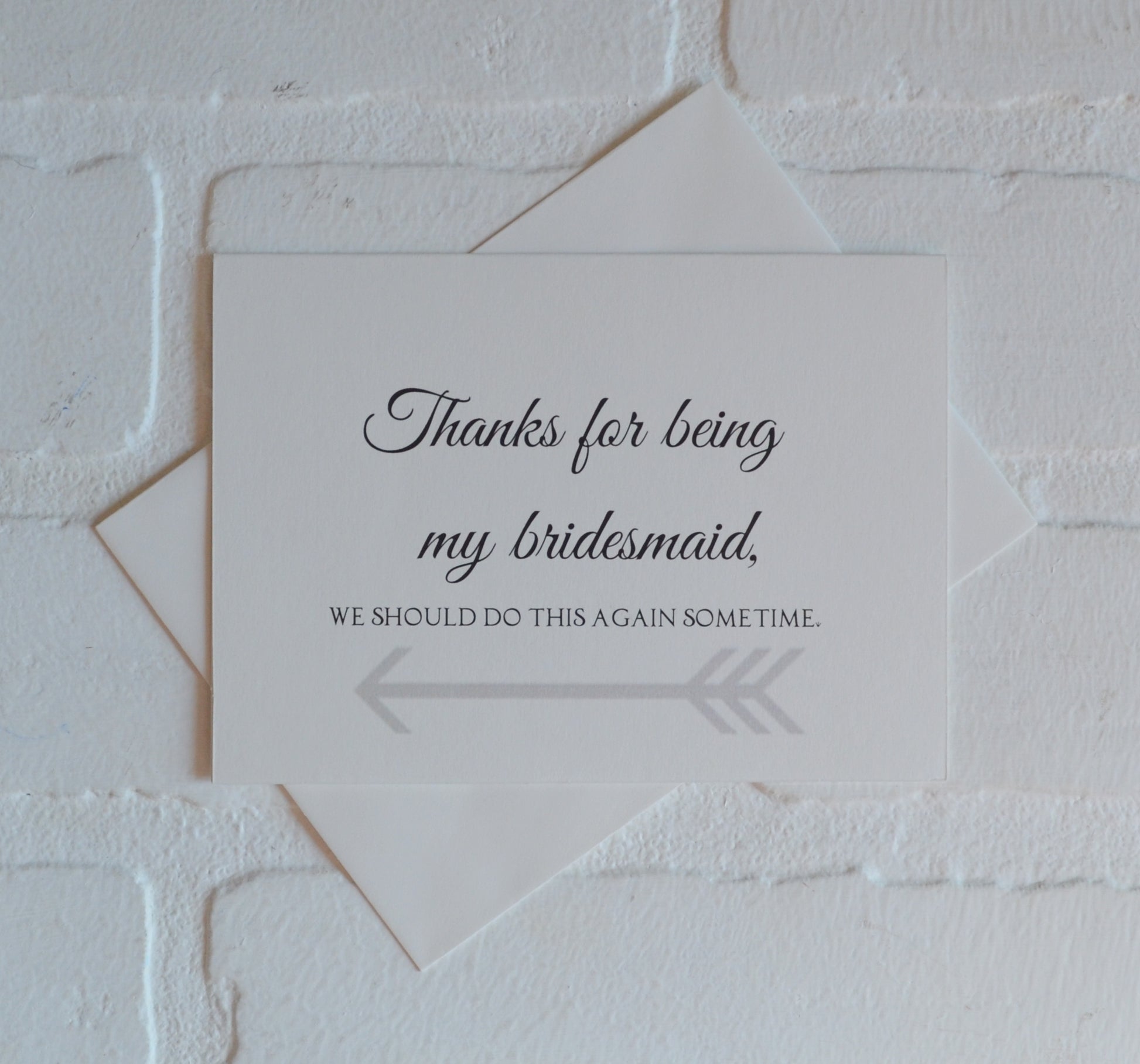 (Outside) "Thanks for being my (bridesmaid, maid of honor, matron of honor, junior bridesmaid, flower girl, bridesman, man of honor OR personal attendant), we should do this again sometime."