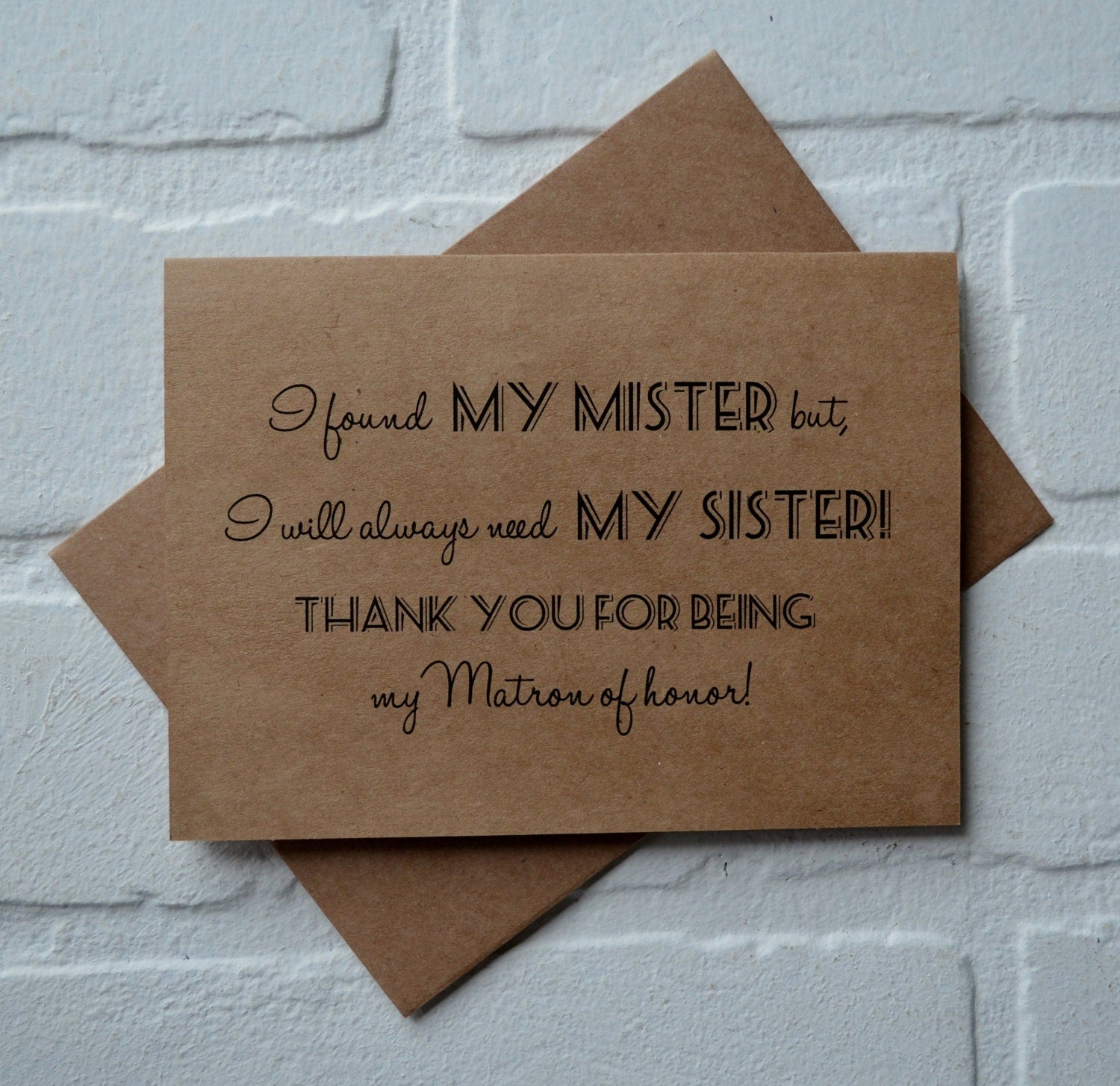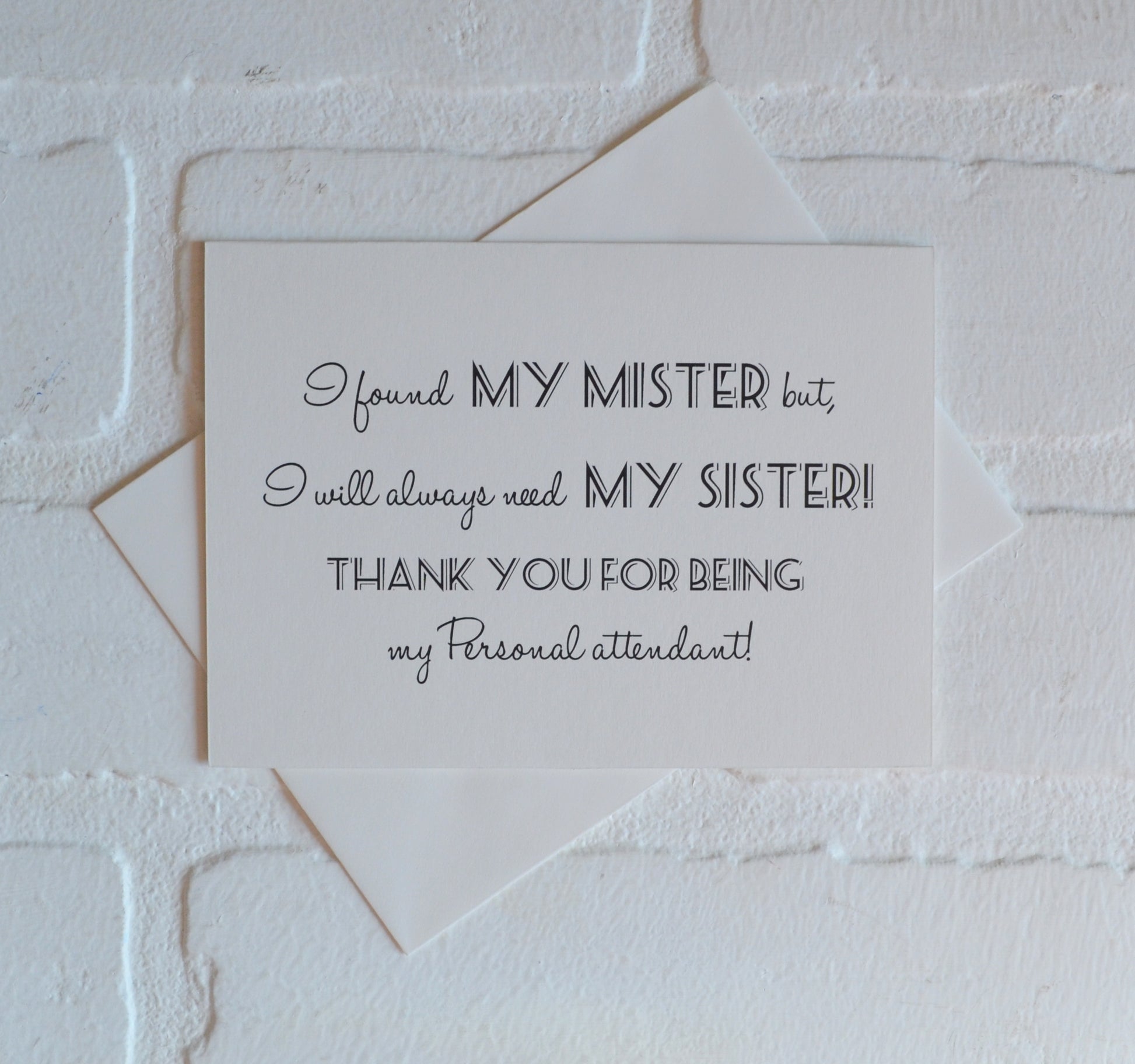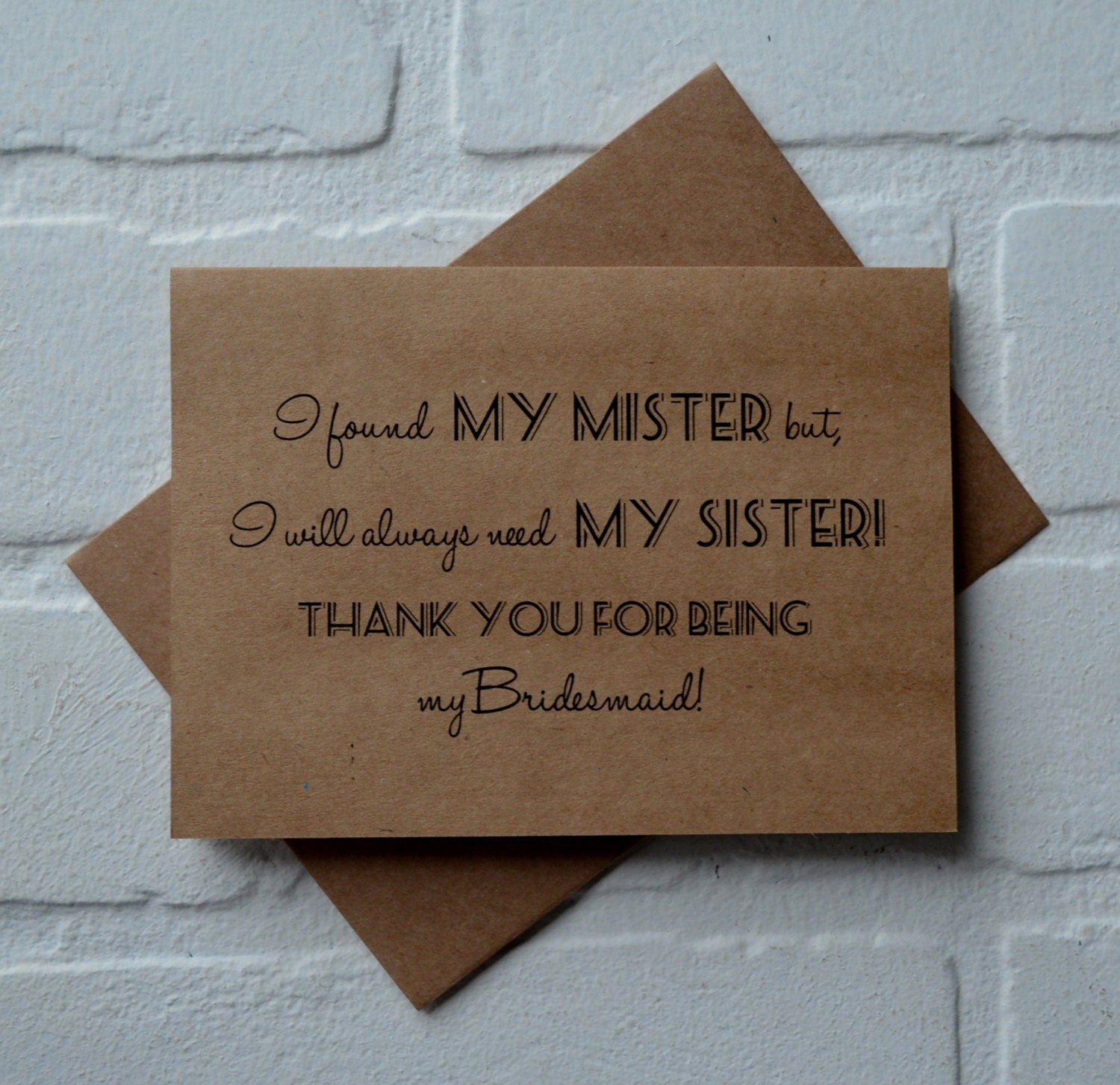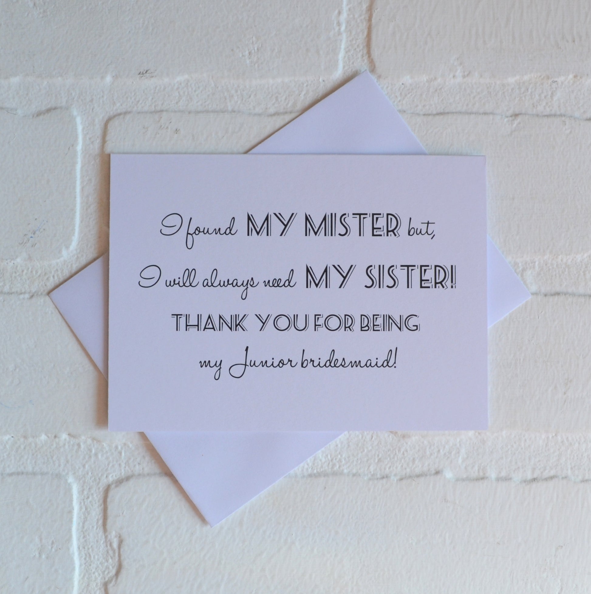 (Outside): "I found my mister...but I still need my sister. Thank you for being my (Bridesmaid, Maid of Honor or Matron of honor)!"