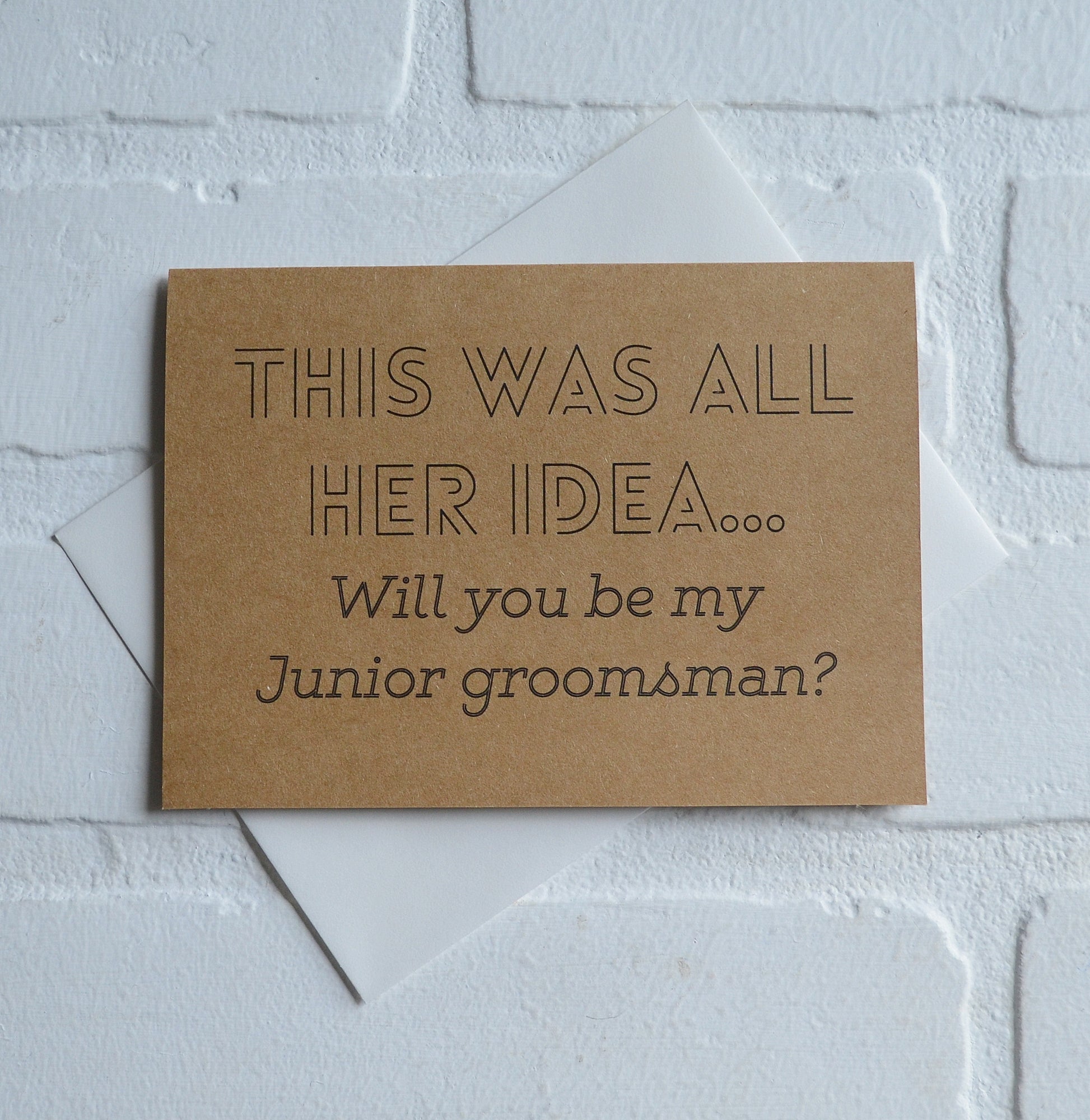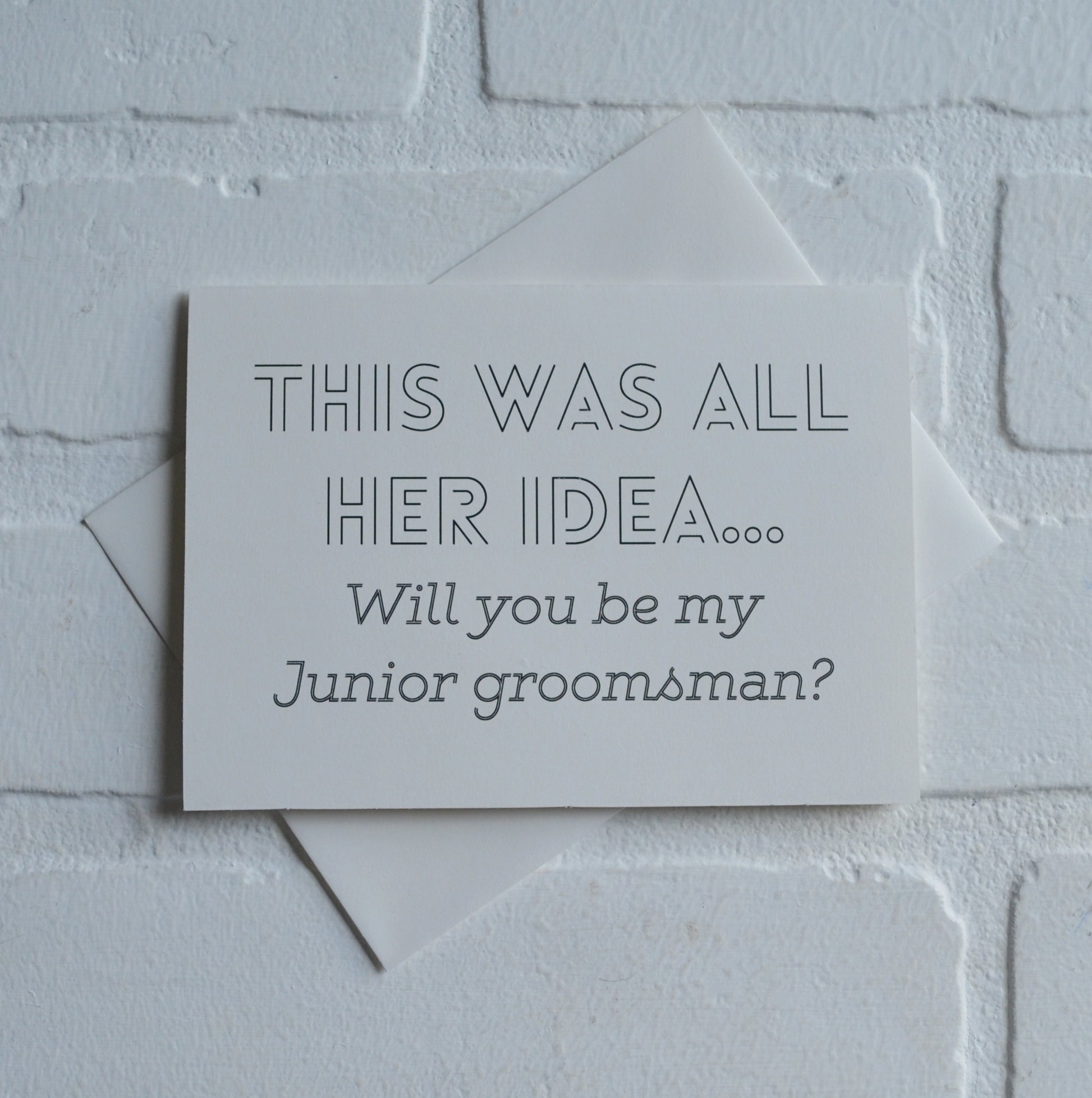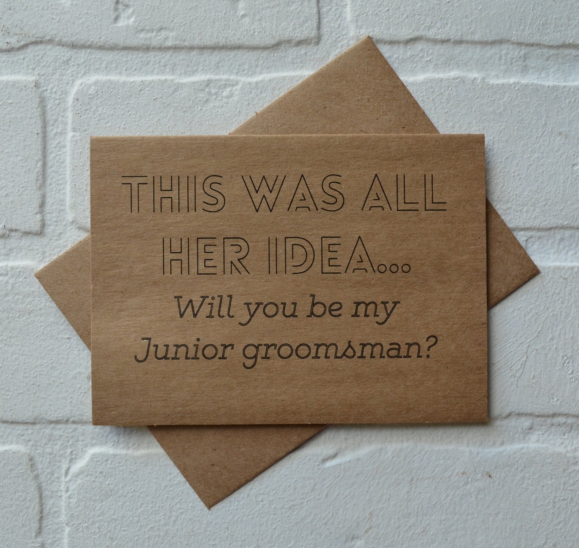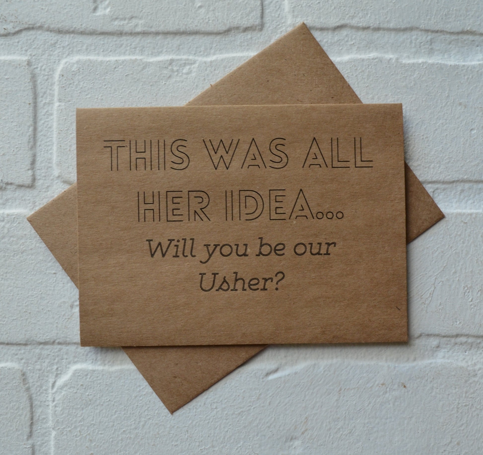 (Outside): "This was all her idea. Will you be my (Best man, Groomsman, Junior groomsman, Ring Bearer or our Usher)?"