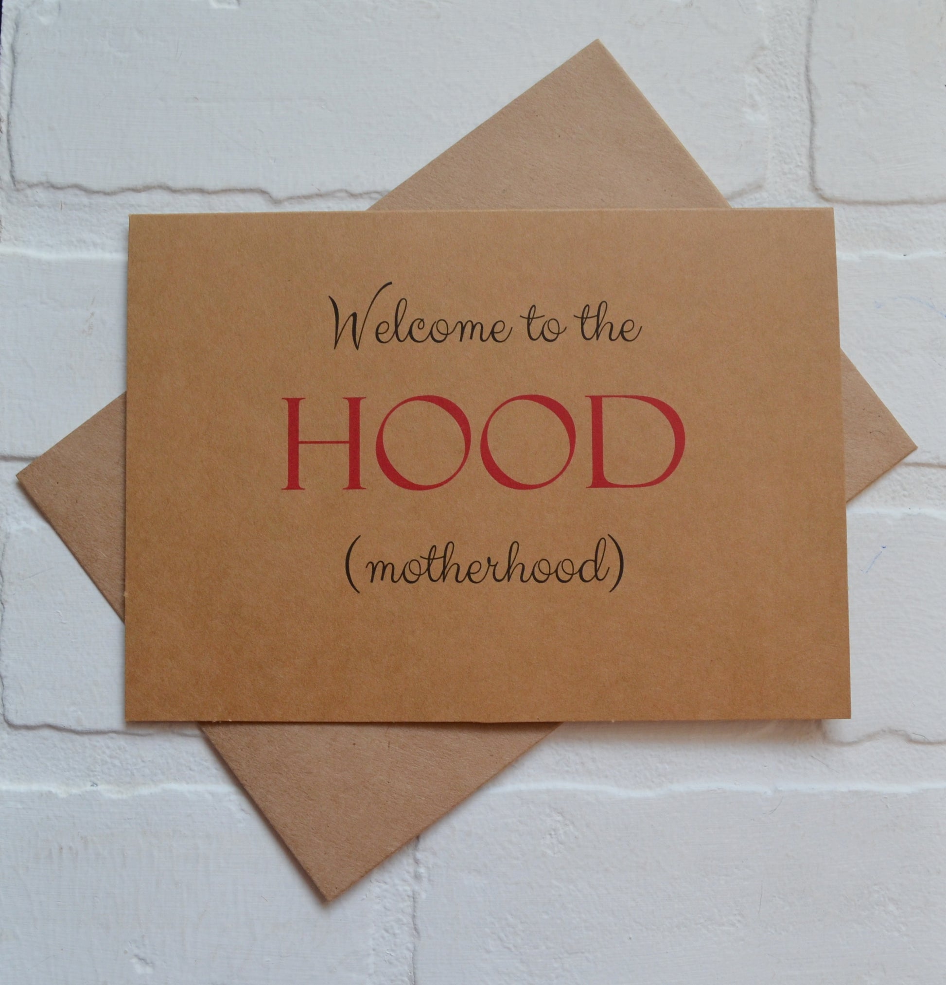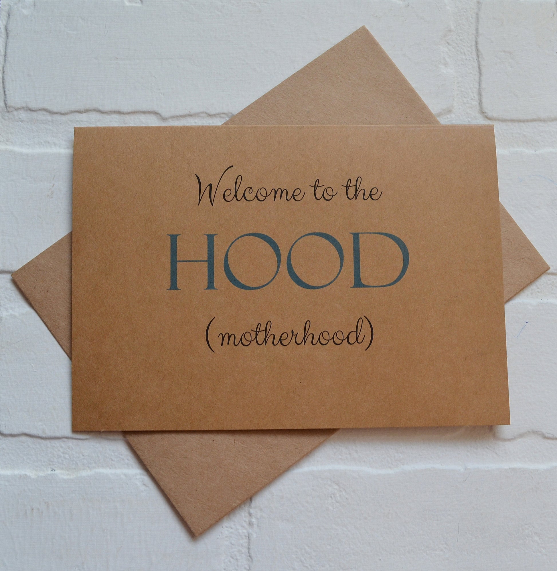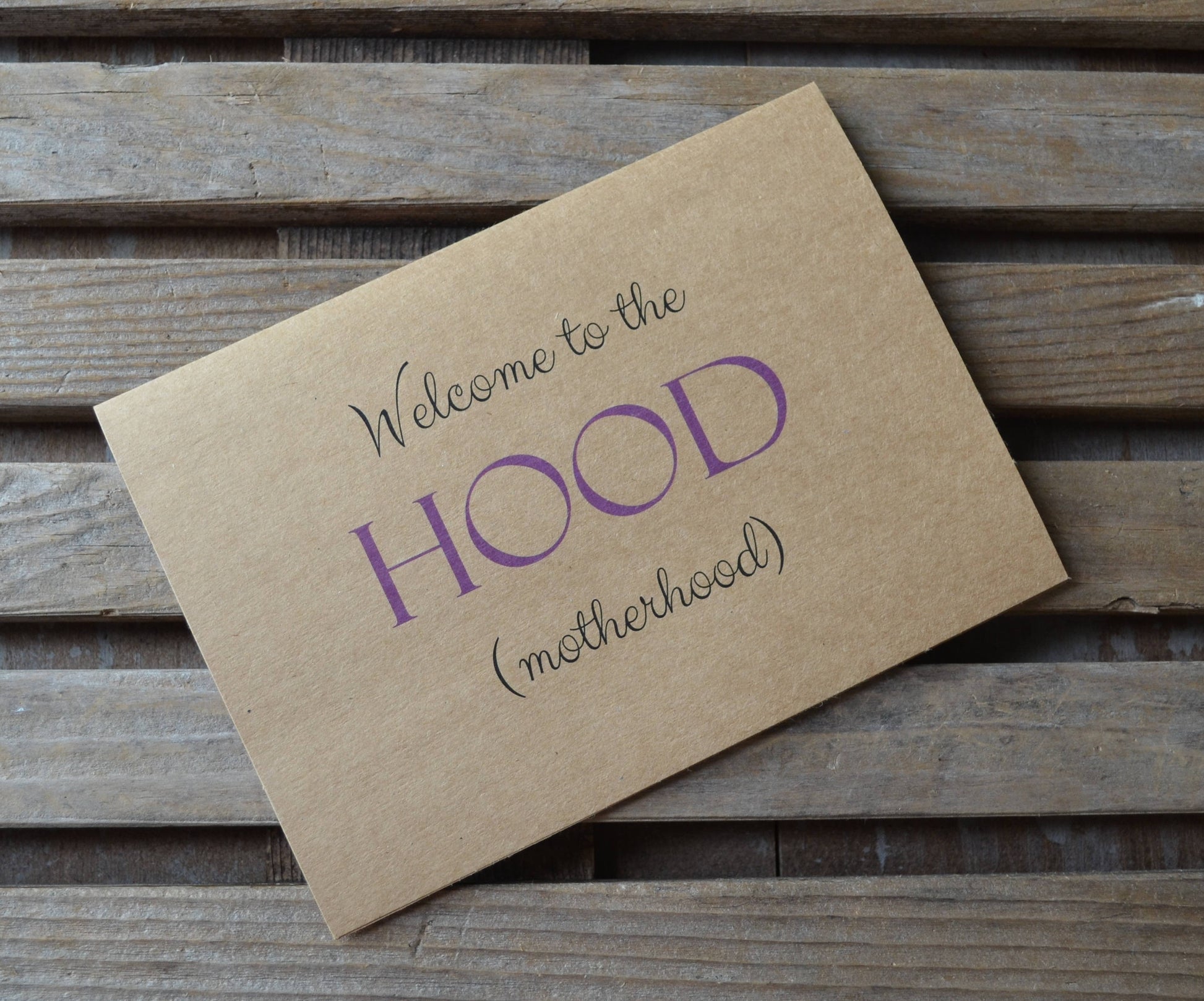 (Outside) "Welcome to the HOOD (motherhood)" CHOOSE COLOR: PURPLE, BLUE, GREEN OR PINK