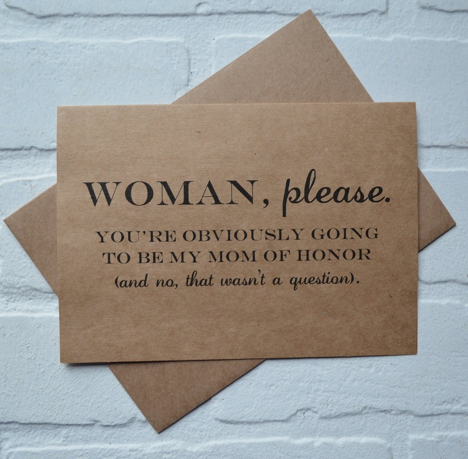 "Will you be my Mom of Honor? Of course, she will be there for the big day (like she always is) but why not ask her in a fun way??!!! Ask mom to be a part of your big day, or just let her know your engaged with this funny card:) Printed on *kraft cardstock including envelope.