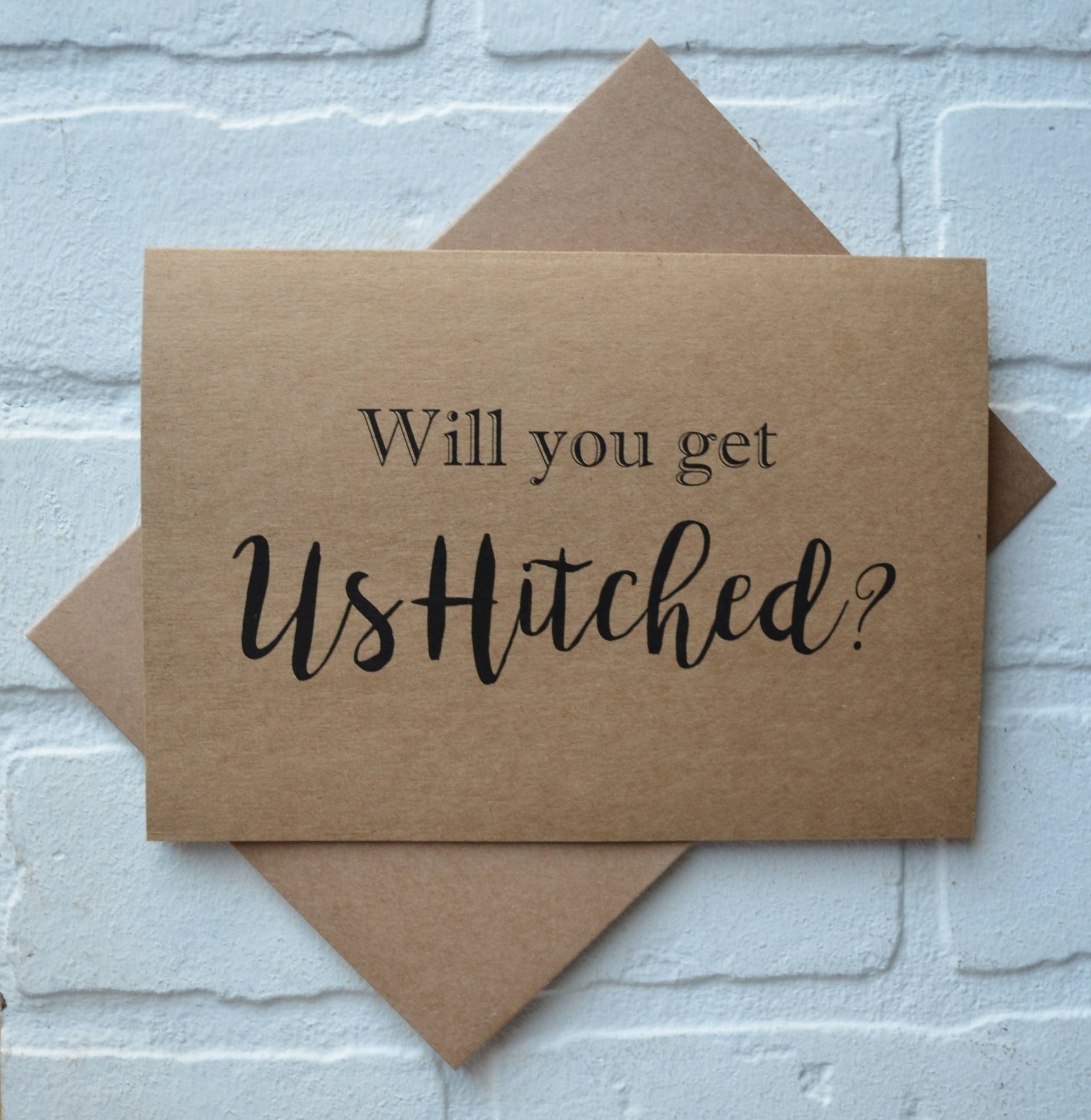 Simple and sweet card to ask someone special to marry you! Whether it's your pastor, a friend or family member doing the honors of marrying you (or in this case, getting you hitched), ask them with this rustic kraft card. Printed on kraft style cardstock including envelope.