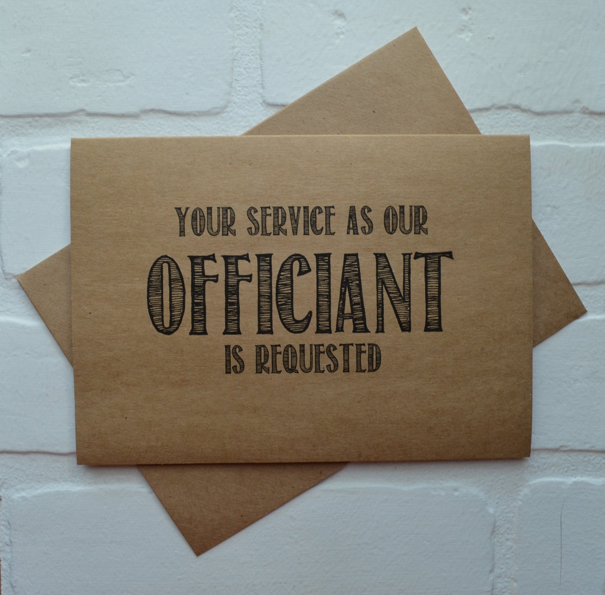 Invite your closet friends to be your officiant at your wedding with this funny bridal card. Let them know their service to stand by your side is needed. Card is printed on *kraft cardstock and comes with matching envelope. If you're going to ask them, ask them in style!