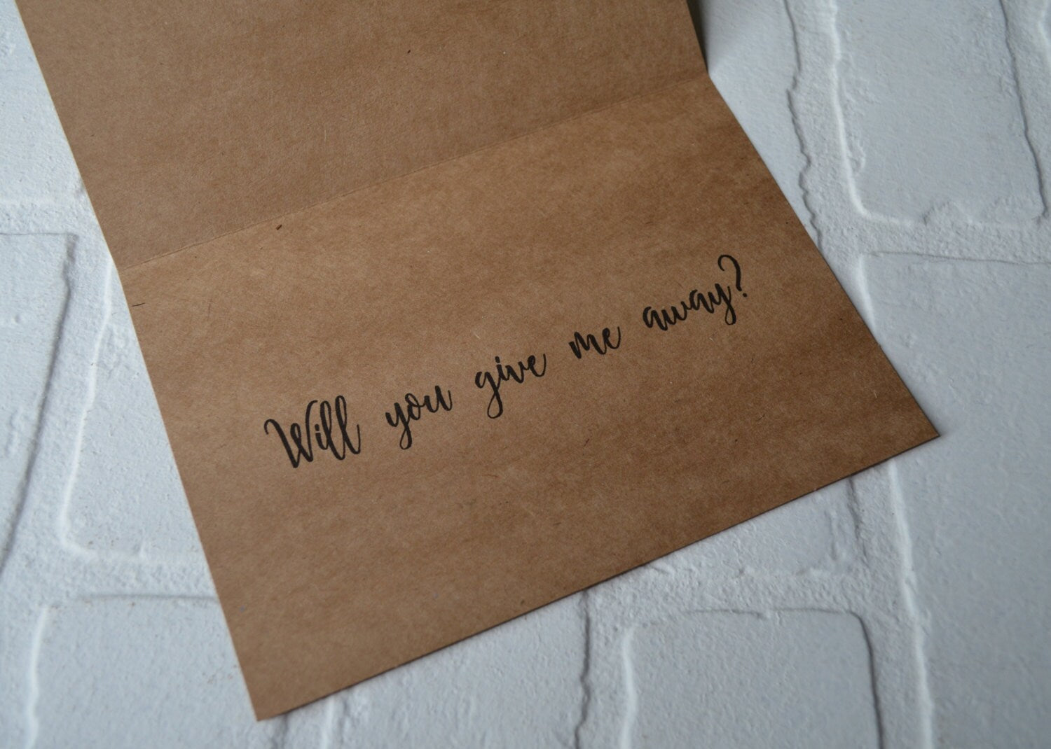 You are getting married and need someone special to give you away. Maybe it's your father, maybe a good friend, ask them with this sweet card. Show the person walking you down the aisle how much you care with this kraft proposal card. Printed on *kraft cardstock including envelope.